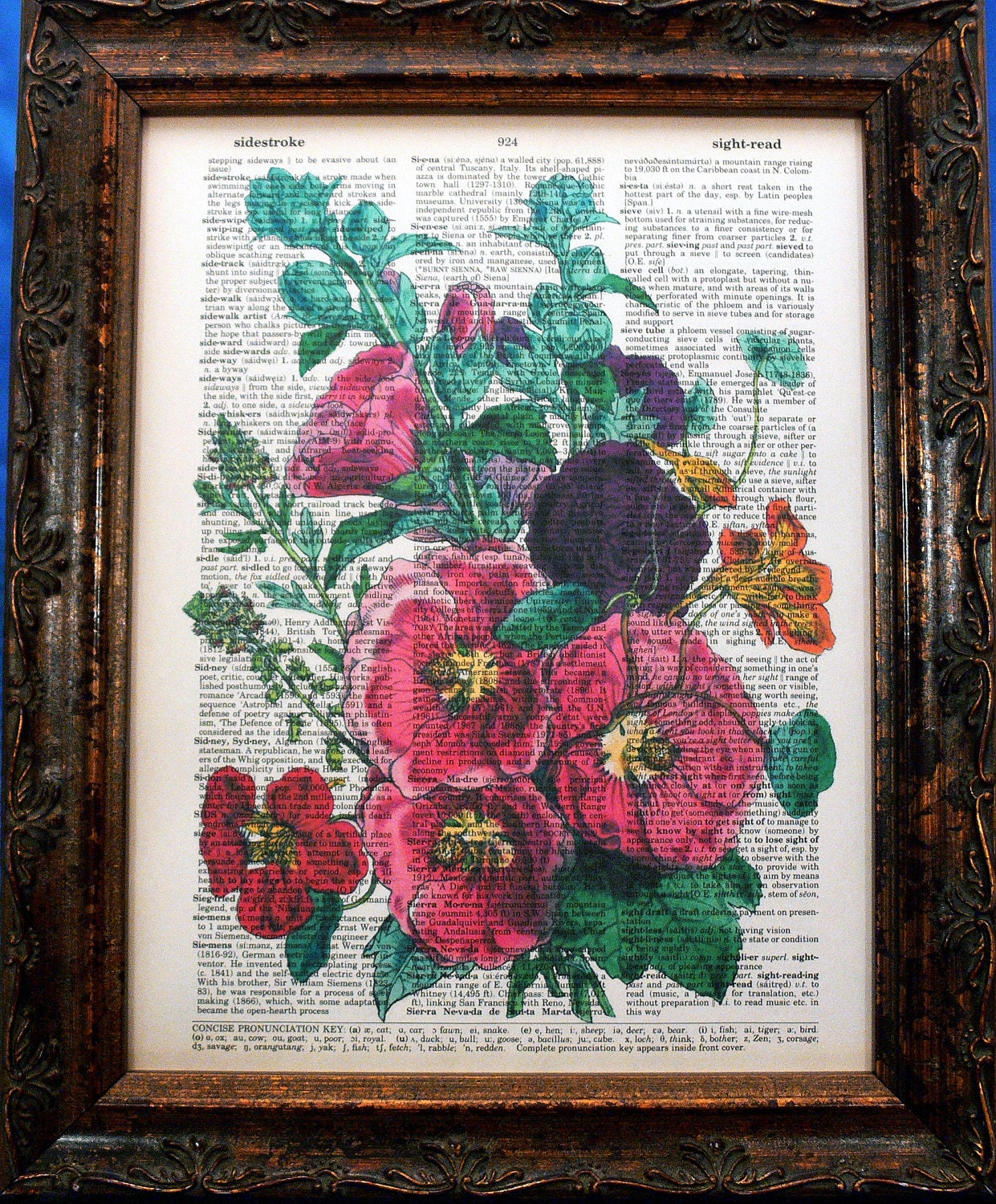 Hollyhocks Flower Art Print On Vintage Dictionary Book Page Etsy
